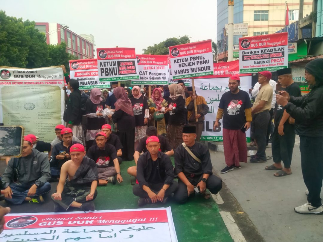 SD, Jakarta, 2 Agustus 2024.Aliansi Santri Gus Dur Menggugat, hari ini, 2 Agustus 2024 menggelar aksi unjuk rasa di depan Kantor Pengurus Besar Nahdatul Ulama (PBNU), Jalan Kramat Raya, Jakarta. Hal ini kami lakukan dikarenakan rasa peduli dan bentuk kecintaan sekaligus rasa keprihatian kami sebagal Santri Gus Dur yang tergabung dalam Aliansi Santri Gus Dur Menggugat.