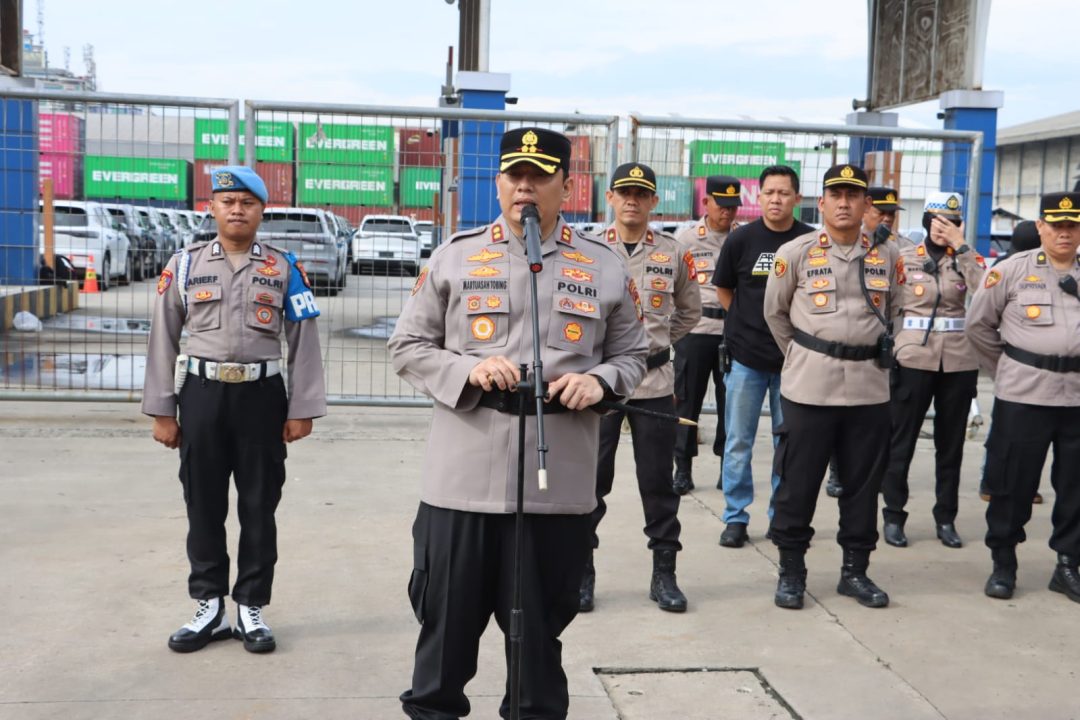 SD, Jakarta Utara – Kapolres Pelabuhan Tanjung Priok pimpin Apel Pengamanan aksi unjuk rasa dari Federasi Buruh Transportasi Pelabuhan Indonesia (FBTPI), menggelar aksi damai di depan Pos 9 Pelabuhan Tanjung Priok Jakarta Utara, Minggu (20/4/2025) pagi.