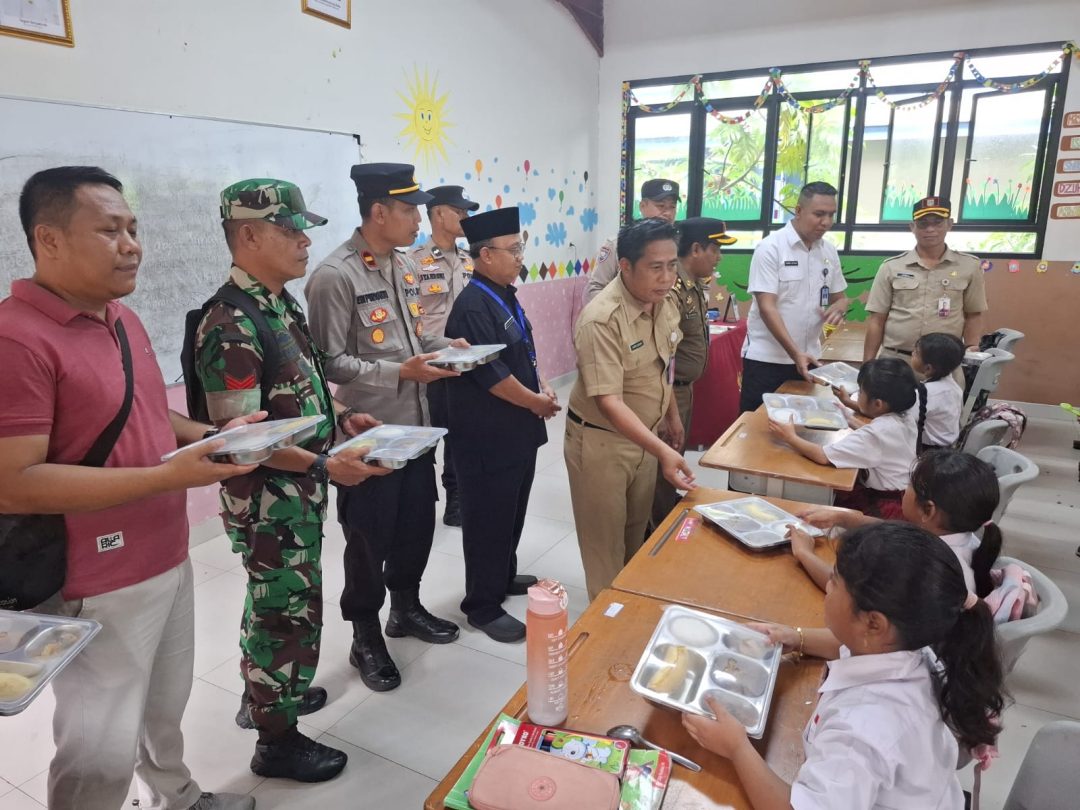 SD, Pulau Pramuka – Kepulauan Seribu – Bhabinkamtibmas Pulau Pramuka, Polres Kepulauan Seribu, Bripka Marwansyah bersama Kanit Binmas Polsek Kepulauan Seribu Aipda Syahroni melakukan monitoring kegiatan *Makan Siang Bergizi* yang diselenggarakan oleh Satuan Pelayanan Pemenuhan Gizi (SPPG) Kepulauan Seribu di Pulau Pramuka, Selasa (18/02/2025).