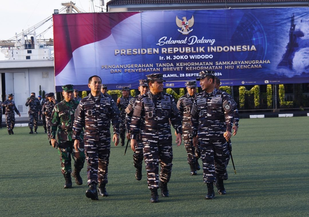 SD, Jakarta – Berita Kolinlamil TNI AL, 27 September 2024 ——- Guna memastikan kesiapan menyambut kedatangan Bapak Presiden RI Ir. H. Joko Widodo pada hari Sabtu 28 September besok. Hari ini, Panglima Kolinlamil Laksda TNI Hudiarto Krisno Utomo, PSC(j) M.A., M.M.S., CHRMP selaku tuan rumah, mendampingi Kepala Staf Angkatan Laut (Kasal) Laksamana TNI Dr. Muhammad Ali, S.E., M.M., M.Tr.Opsla., melaksanakan pengecekan kesiapan Dermaga Mako Kolinlamil dan melihat pelaksanaan gladi parsial penyambutan RI 1, Jumat (27/9) sore.