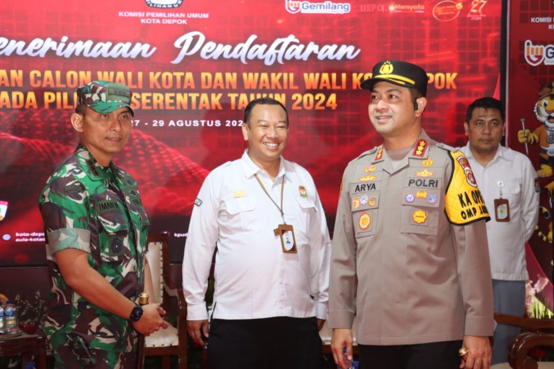 SD, Depok, 29 Agustus 2024 – Kapolres Metro Depok, Kombespol Arya Perdana, SH., SIK., MSi., bersama Dandim 0508/Depok Kol Inf Iman Widhiarto, turut serta dalam pengamanan jalannya proses pendaftaran paslon Walikota Depok di Kantor Komisi Pemilihan Umum (KPU) Kota Depok. Kombespol Arya Perdana yang didampingi oleh sejumlah Pejabat Utama Polres Metro Depok, memastikan bahwa pengamanan berjalan lancar dan tertib di lokasi tersebut.