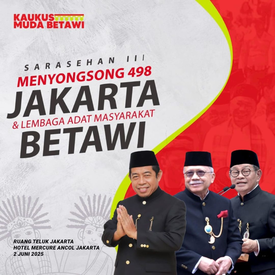 SD, JAKARTA – Menjelang hari jadi Kota Jakarta ke-498, Kaukus Muda Betawi kembali menggelar Sarasehan III sebagai bentuk konsistensi dalam memperkuat peran dan posisi Lembaga Adat Masyarakat Betawi. Kegiatan ini akan dilangsungkan pada 2 Juni 2025 di Hotel Mercure Ancol, dengan mengusung tema “Menyongsong 498 Tahun Kota Jakarta dan Lembaga Adat Masyarakat Betawi”.