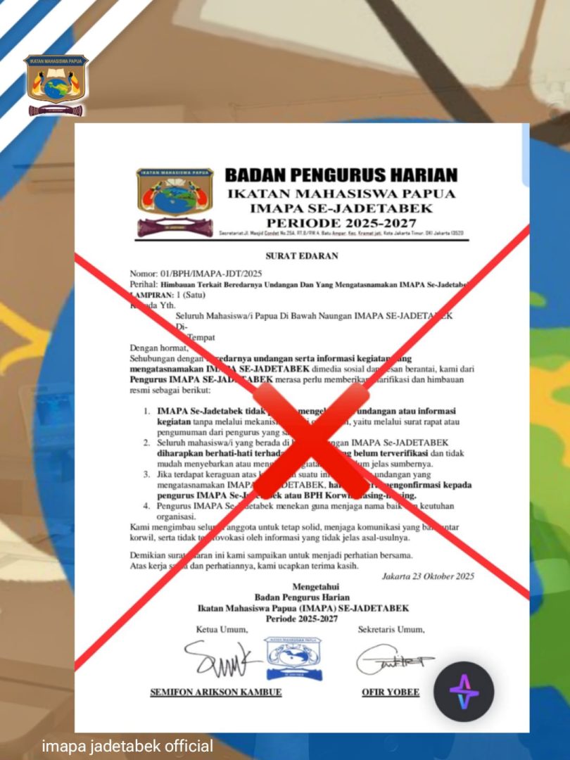 Suarademokrasi.co.id, Jakarta –Pengurus Ikatan Mahasiswa Papua (IMAPA) Jadetabek menyampaikan klarifikasi resmi terkait beredarnya sebuah surat yang mengatasnamakan IMAPA dan berisi upaya membatasi serta mengintervensi program kerja Ketua Umum IMAPA Jadetabek, Akianus Wenda. Melalui keterangan tertulis ini, pengurus menegaskan bahwa surat tersebut palsu dan tidak pernah diterbitkan oleh struktur resmi organisasi.