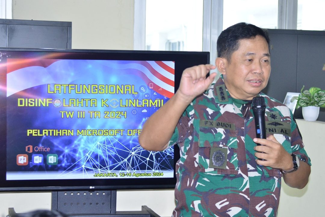 SD, Jakarta – Berita Kolinlamil TNI AL, 12 Agustus 2024 ——- Dinas Informasi dan Pengolahan Data Komando Lintas Laut Militer mengadakan Latihan Fungsional Disinfolahta Triwulan III tahun 2024 dengan materi pelatihan seputar microsoft office.