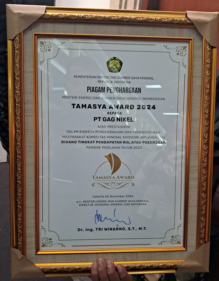 Diakhir acara Minerba Expo 2024 digelar acara Tamasya Award. Pada kesempatan ini PT. GAG NIKEL meraih Kategori Implementasi Bidang Tingkat Pendapatan Riil atau Pekerjaan.