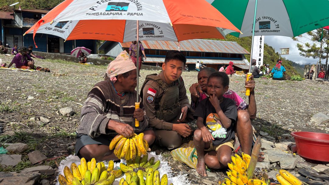 Personel Satbrimob Polda Papua, Bripda Rafly, yang tergabung dalam Operasi Damai Cartenz-2025 penugasan Puncak Jaya, turun langsung membagikan payung kepada para pedagang. Salah satu penerima bantuan tersebut adalah Lentera Wenda, seorang mama Papua yang sehari-hari berjualan di pasar.