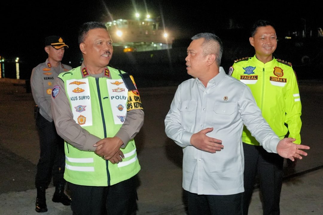 SD, Cilegon – Kakorlantas Polri Irjen Pol Drs. Agus Suryonugroho S.H, M.Hum bersama Menteri Perhubungan (Menhub) Dudy Purwagandhi meninjau kondisi Pelabuhan Merak, Banten, Minggu (23/3/2025).
