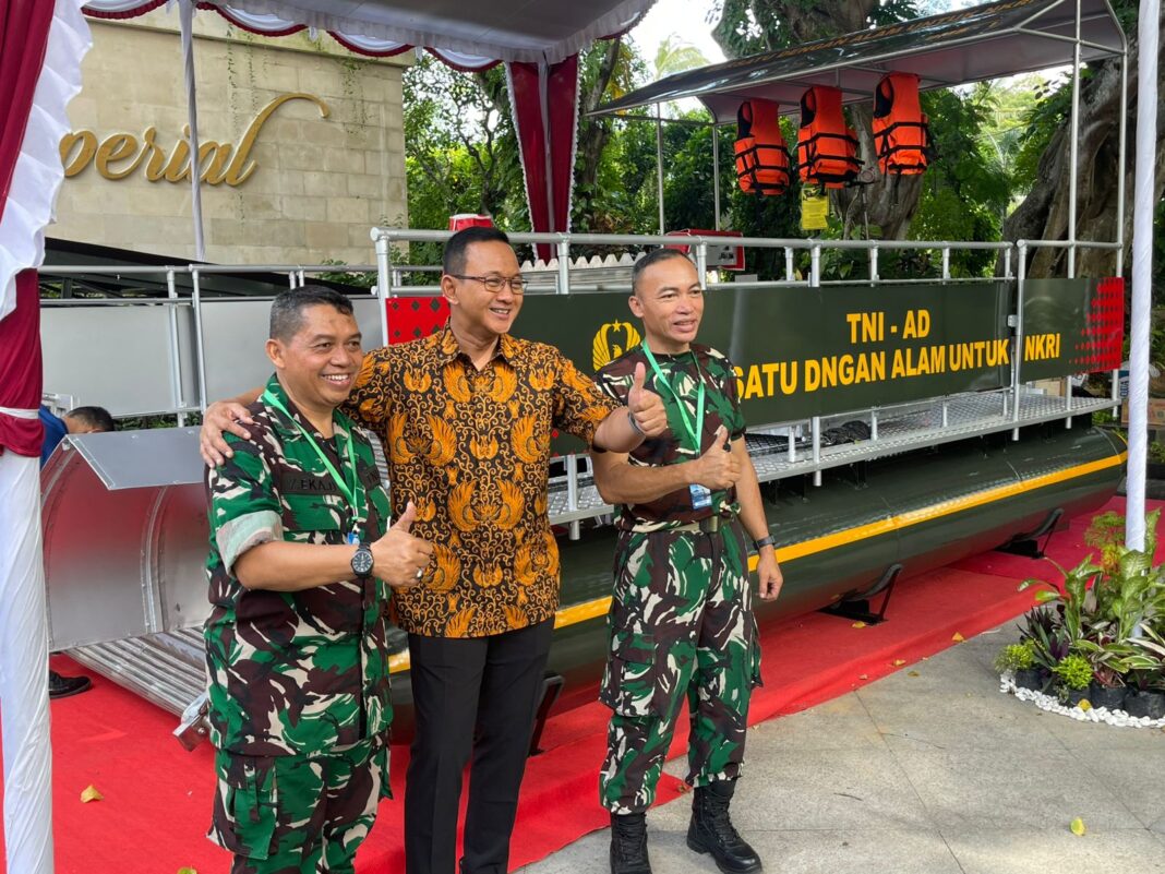 SD, JIMBARAN – Pada ajang _Bali Ocean Days_ yang digelar di Jimbaran, Bali, TNI Angkatan Darat menampilkan inovasi unggulannya dalam menangani permasalahan sampah di perairan, yaitu perahu ponton penyapu sampah. Alat ini dirancang untuk membersihkan sungai dan danau dari sampah serta eceng gondok yang kerap menghambat aliran air dan mengancam ekosistem.