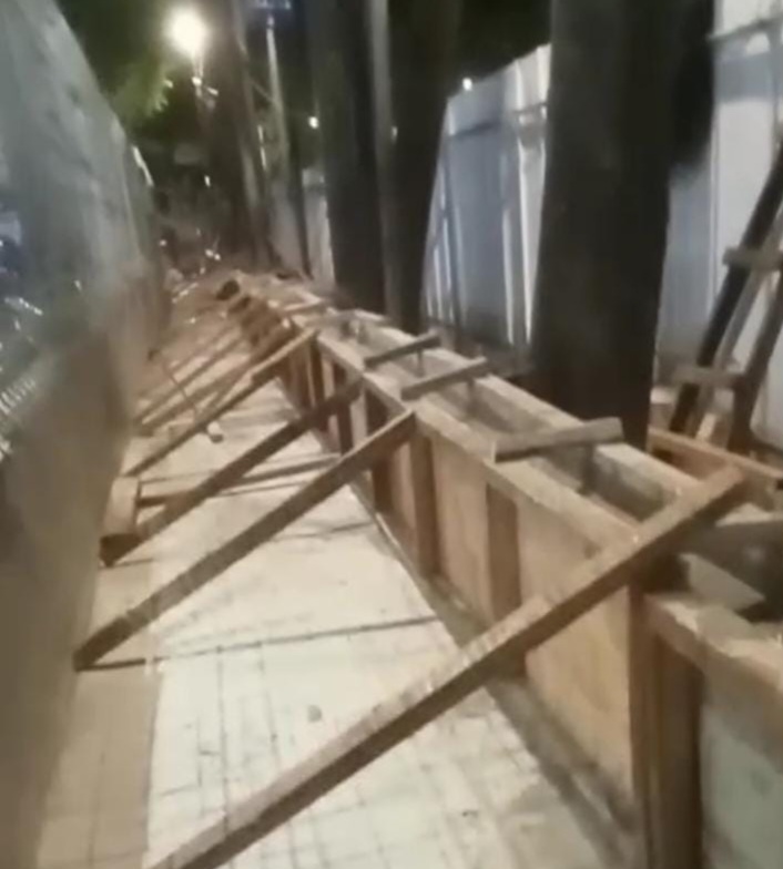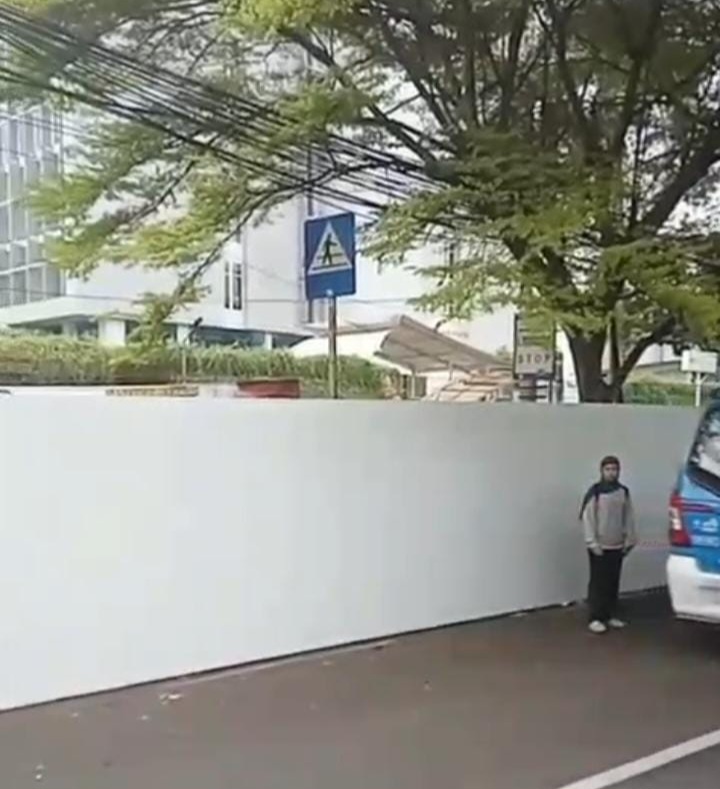 Kondisi tersebut kini menjadi sorotan di sepanjang trotoar depan RS Pelni, Petamburan, Jakarta Barat. Area yang seharusnya dapat diakses bebas oleh pejalan kaki justru tertutup seng dan rangka baja ringan. Di lokasi terlihat pembongkaran saluran air di bawah trotoar, penebangan pohon, serta penjagaan intensif oleh Satpol PP hampir setiap hari.